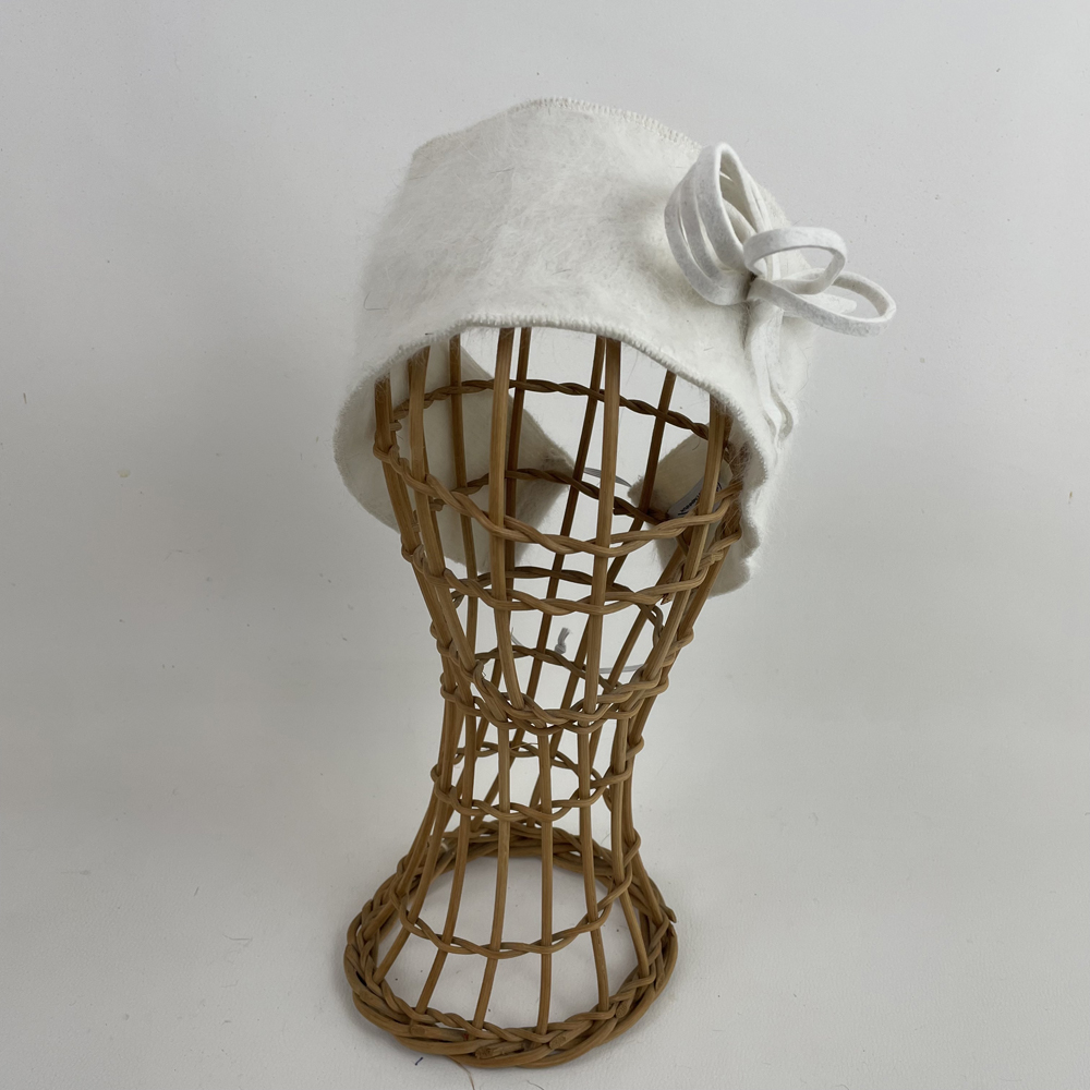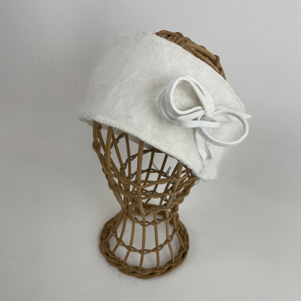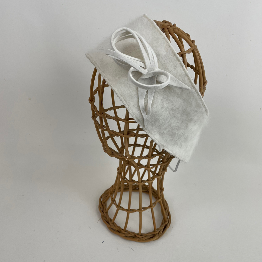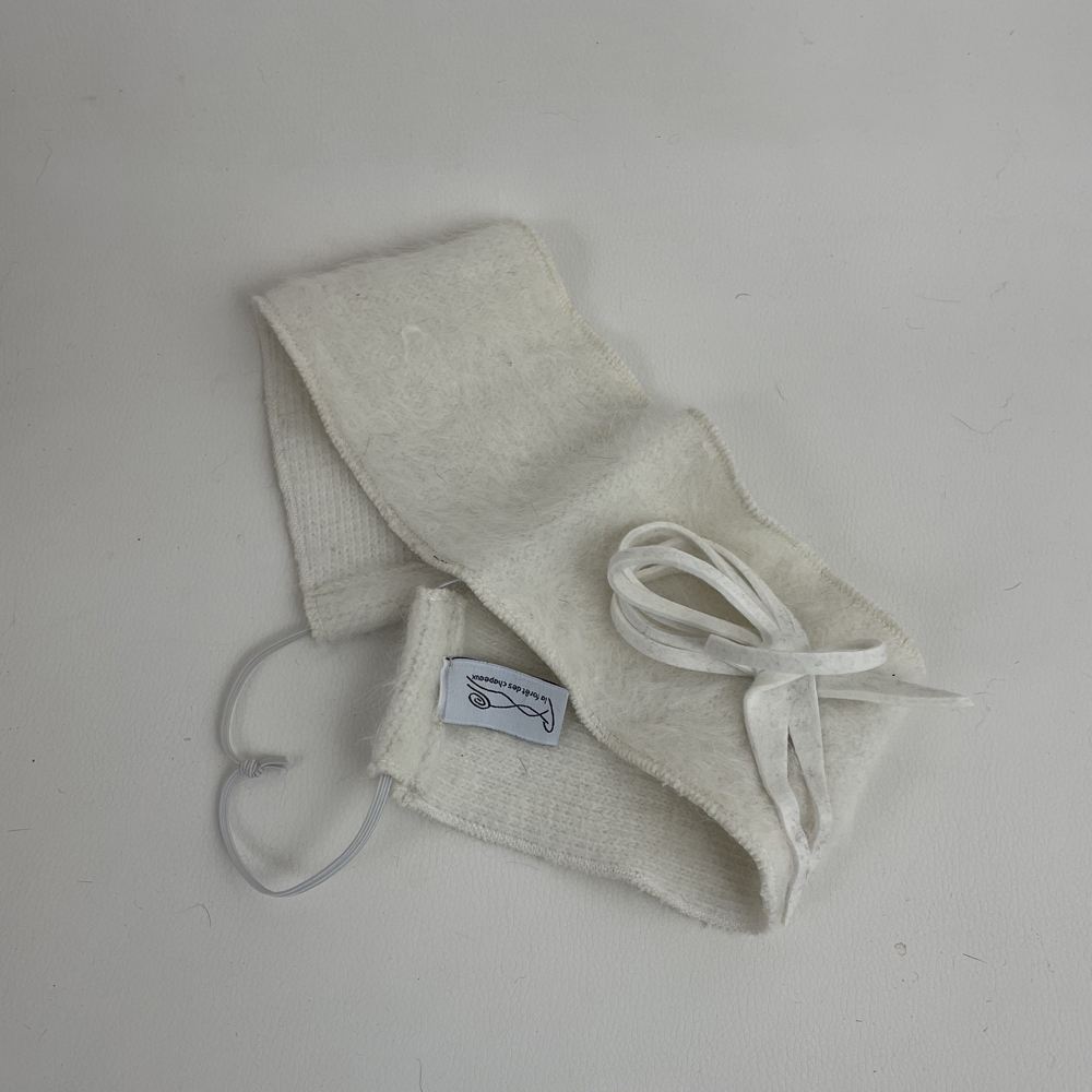 Bandeau en angora blanc, garni d’une boucle en feutre de lapin blanc. Taille ajustable par élastique qui se glisse dans la nuque.