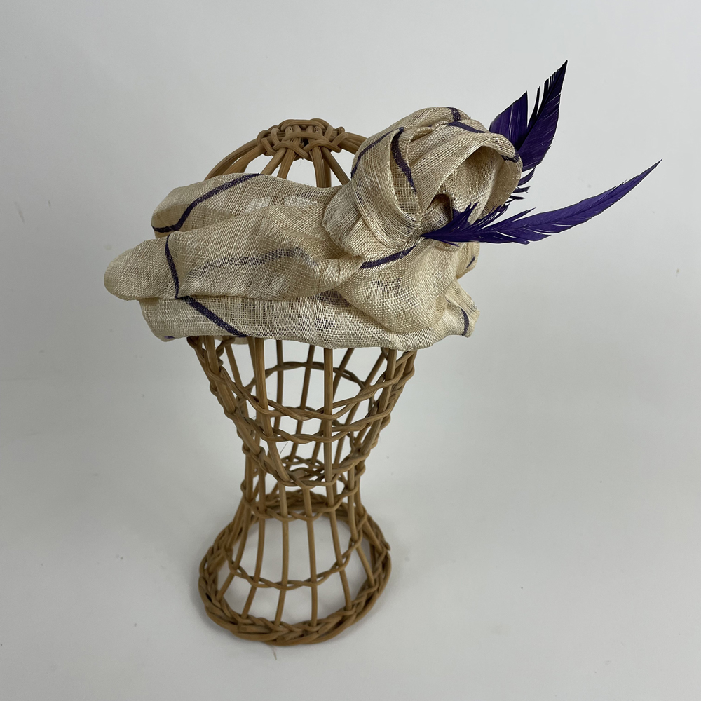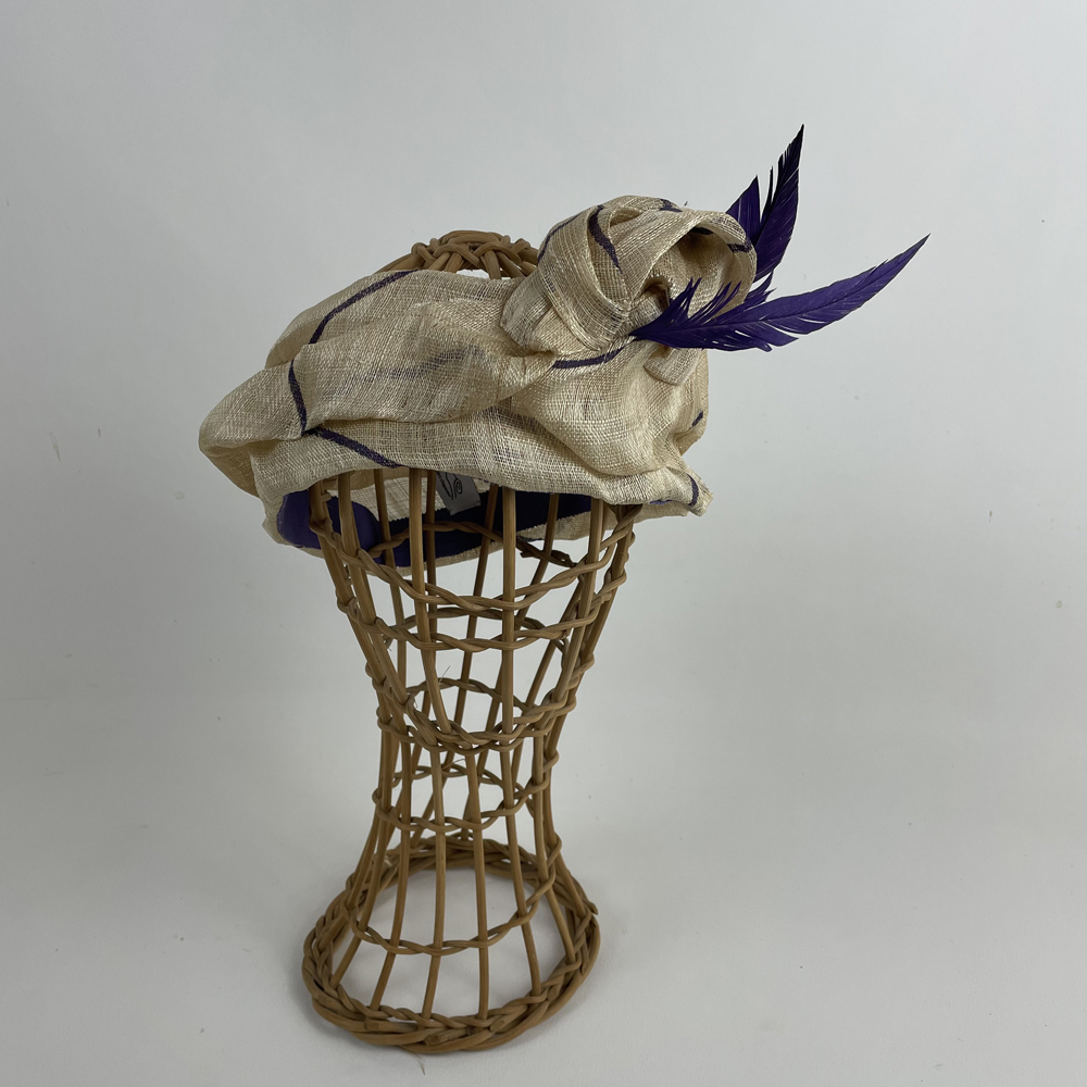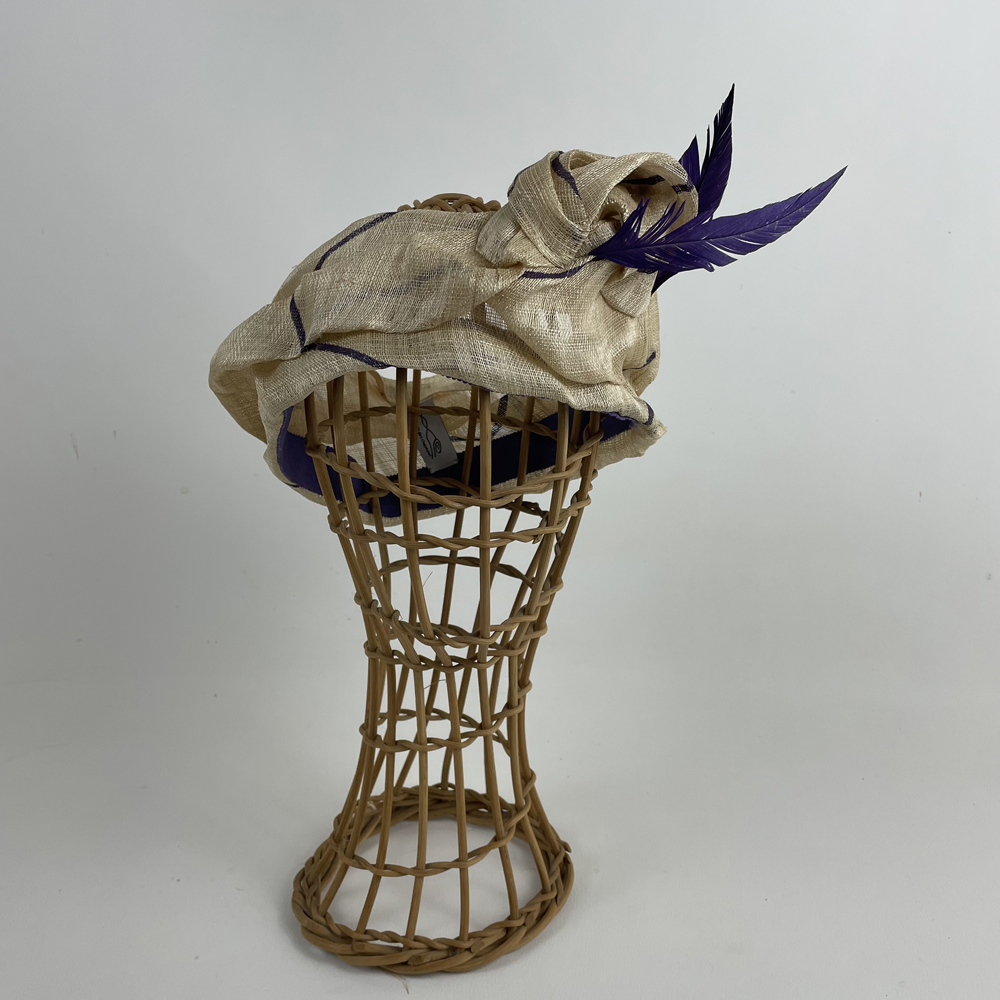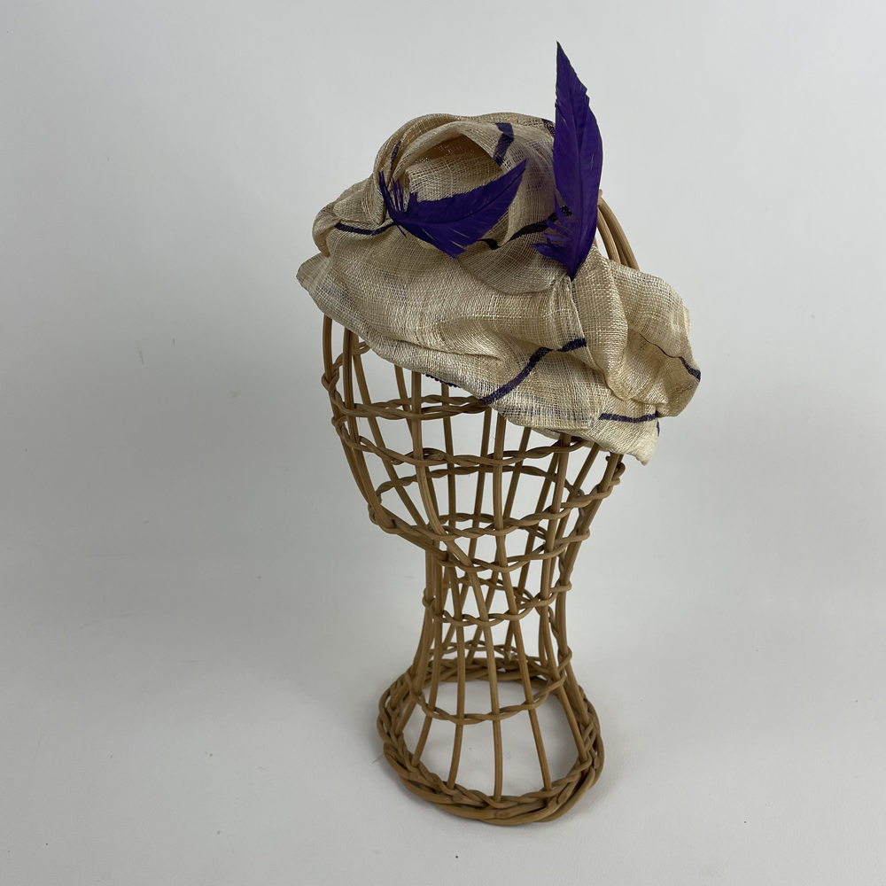 Un bandeau en fibre d’abacca beige réhaussé de violet pour rehausser vos tenues.