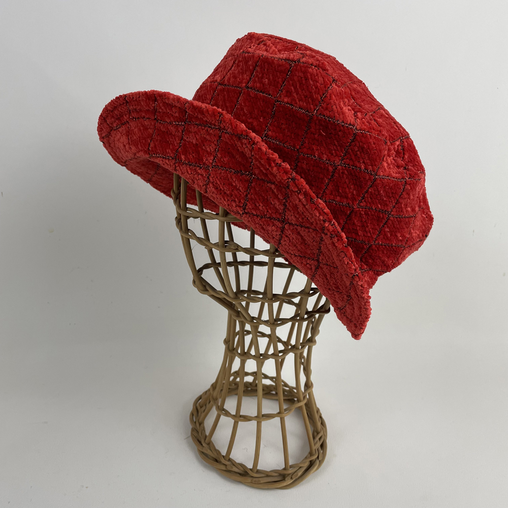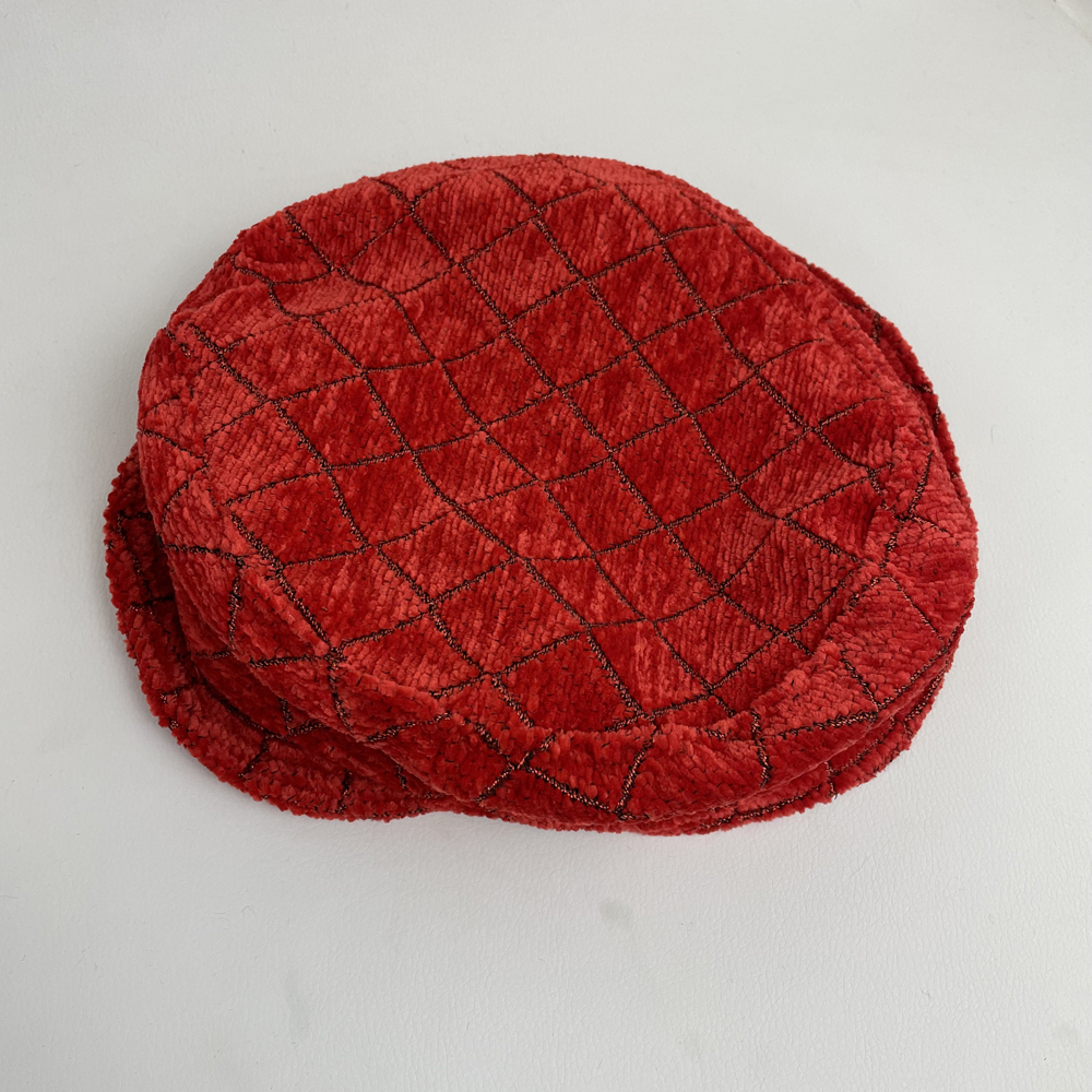 Chapeau casquette en velours chenille rouge quadrillé noir & or entièrement doublée d’un jersey d’angora rouge. Diamètre 25 cm. Visière souple doublée d’une toile de coton. Lavage machine en programme laine à froid OU à la main. Pas de sèche linge.