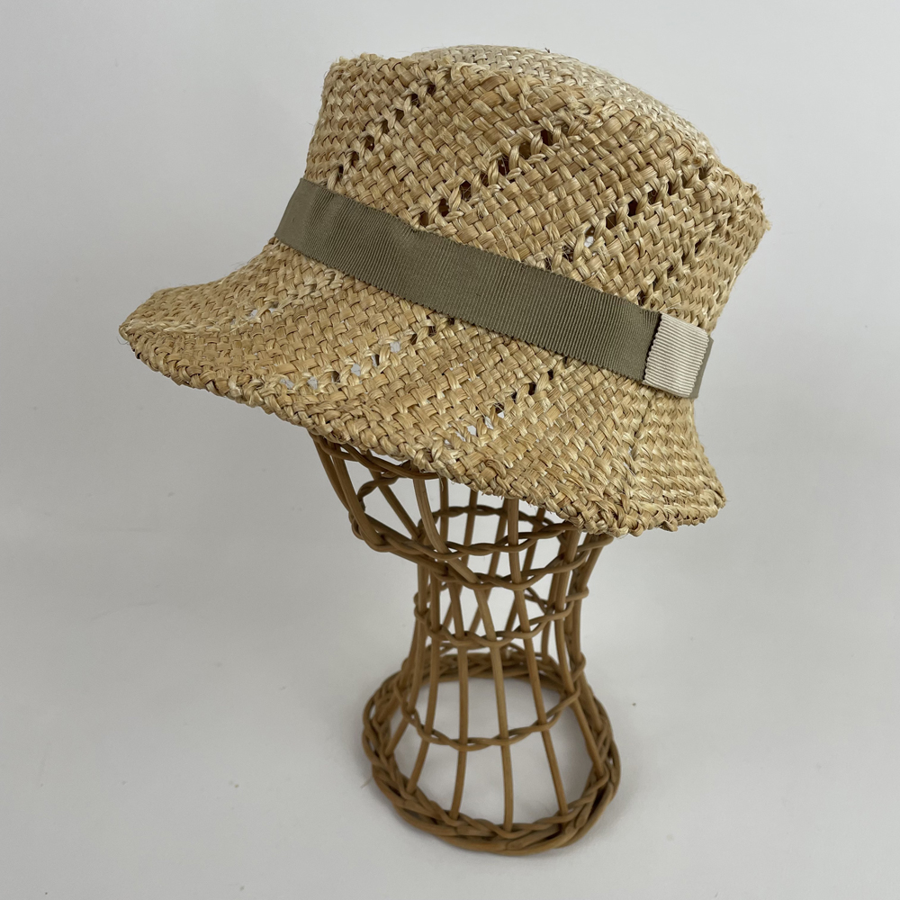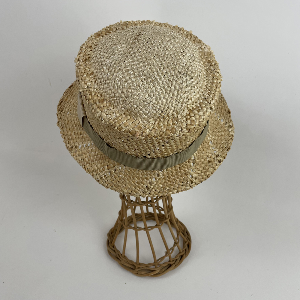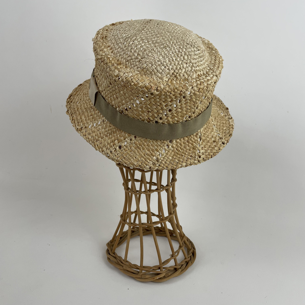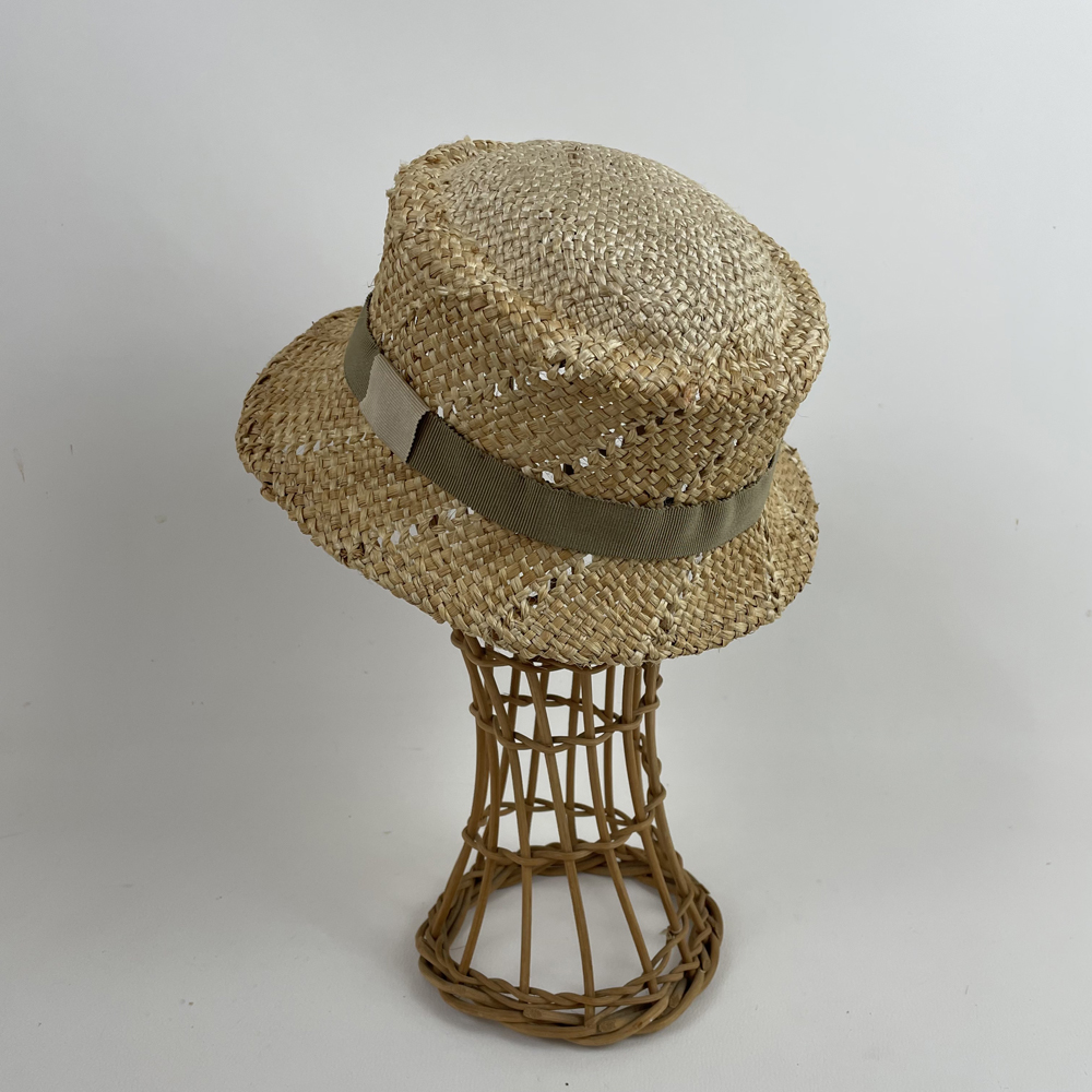 Chapeau cloche en paille de blé & jute garni d’un gros grain en coton vert kaki.