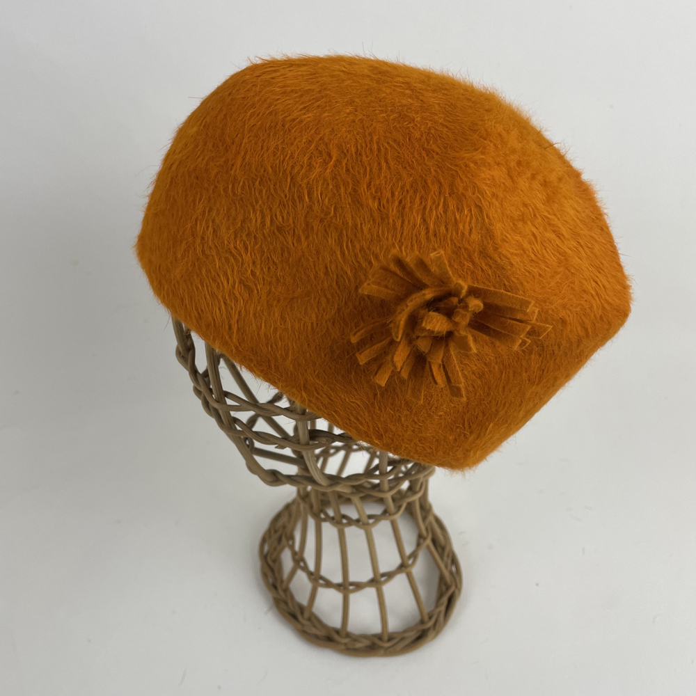 Un béret bien gonflé, en feutre flamand orange pour apporter une belle touche de couleurs.