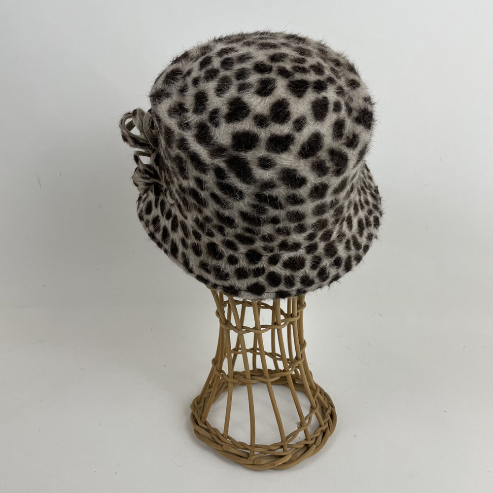Chapeau cloche en feutre flamand (lapin finition poils étirés) imprimé léopard. Un chapeau mis en forme est un objet, aussi il se respecte comme tel et ne peut se plier. Stockage à plat.
