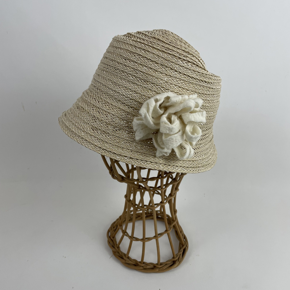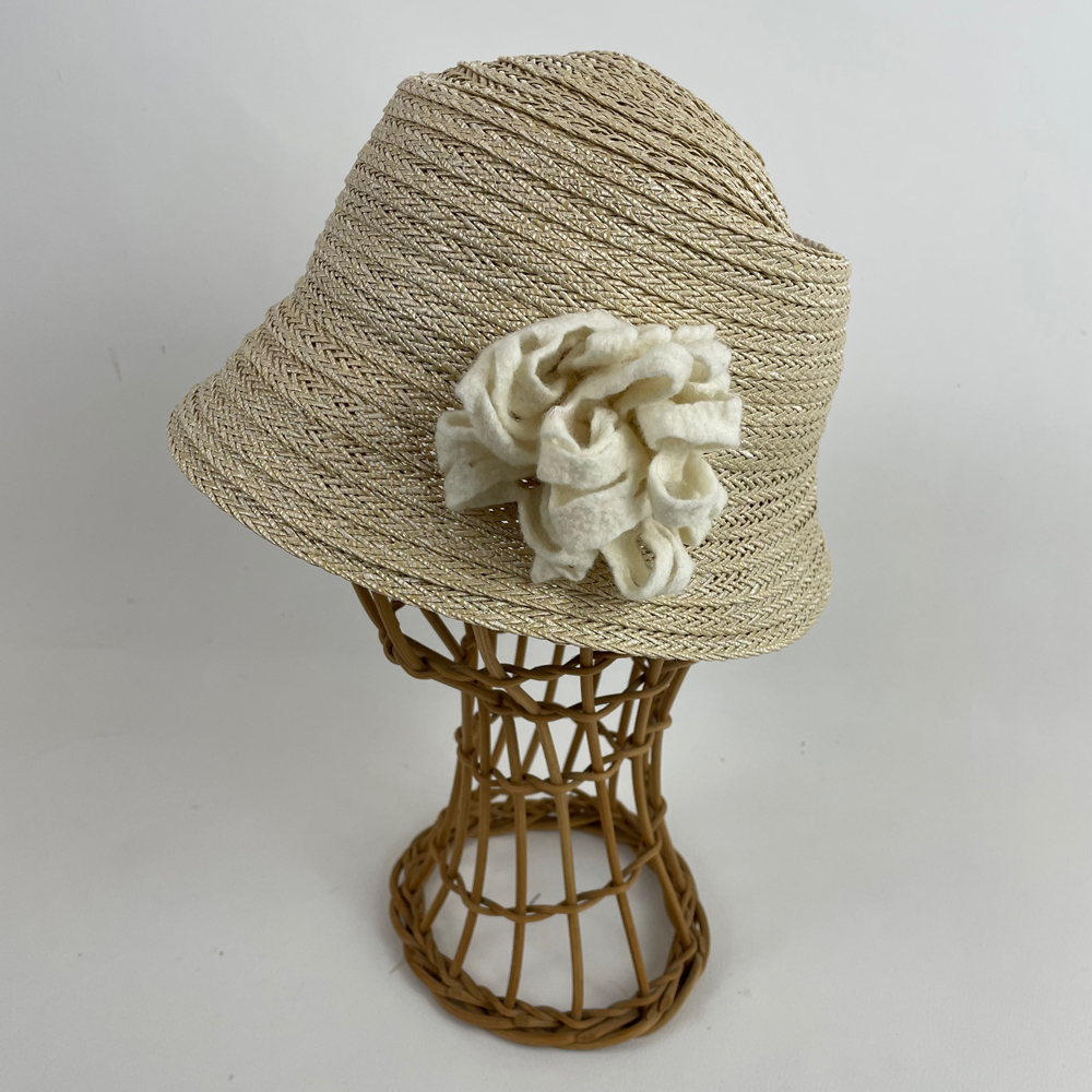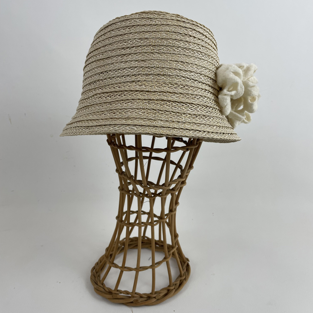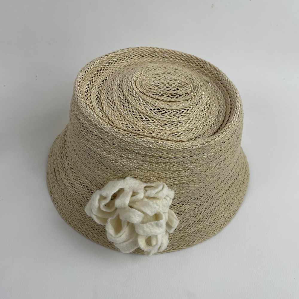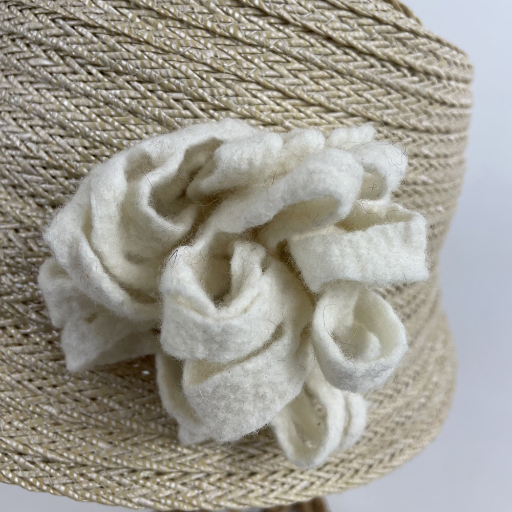 Chapeau cloche en gallon de rafia ligaturé écru et garni d’une fleur blanche en laine mérinos d’Arles feutrée à la main.