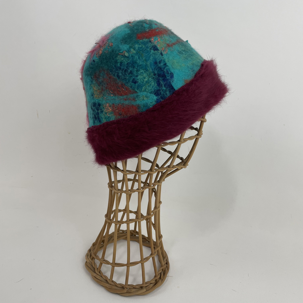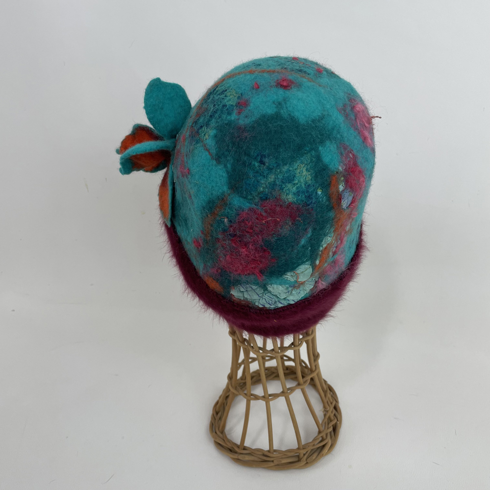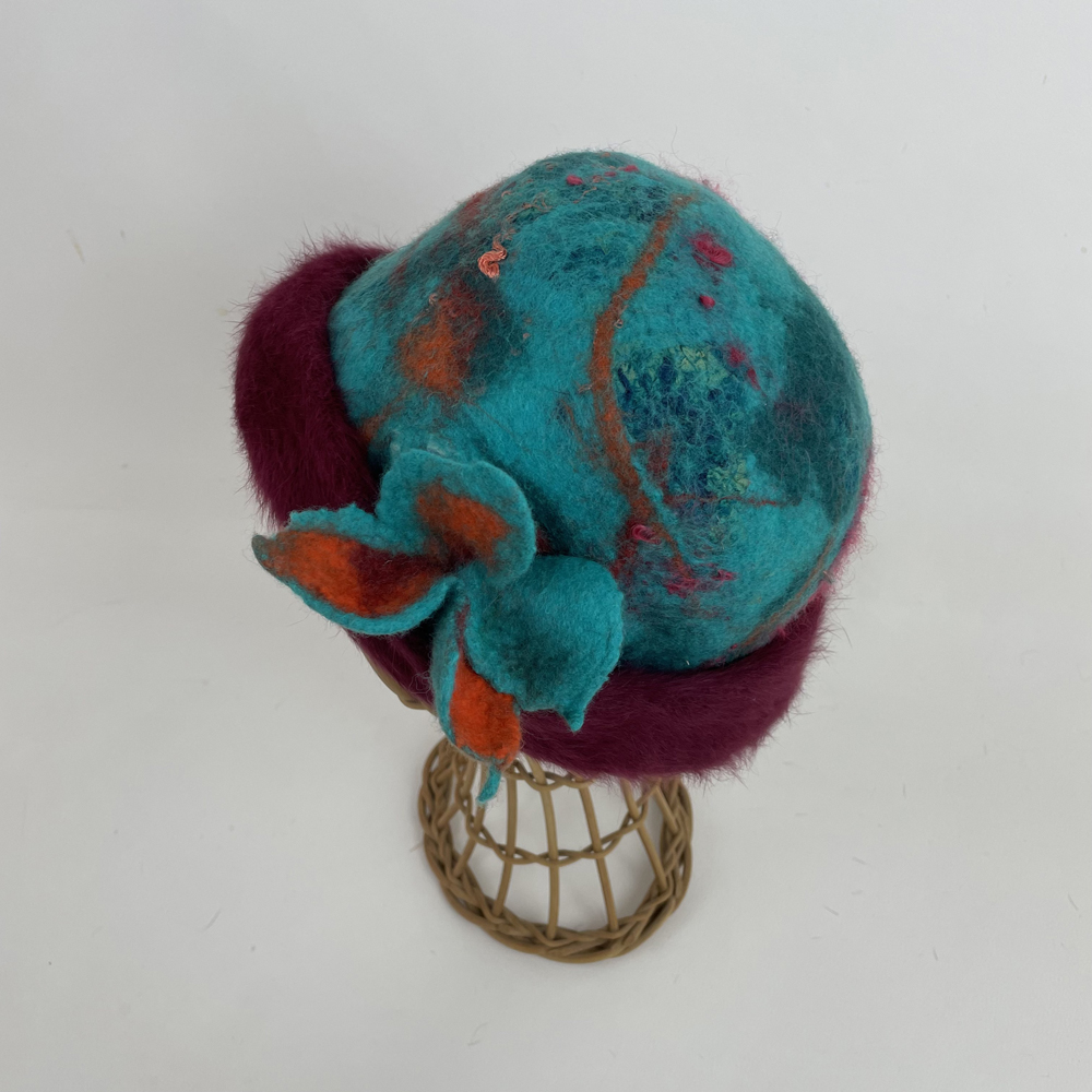 Il s’agit d’une étoffe confectionnée manuellement à partir de enchevêtrement de longues fibres de laines mérinos turquoise non filées et de l’incorporation de tissus de soie multicolores. Le feutrage à l’eau savonneuse tiède fige le motif intégré tout en créant le volume du chapeau.