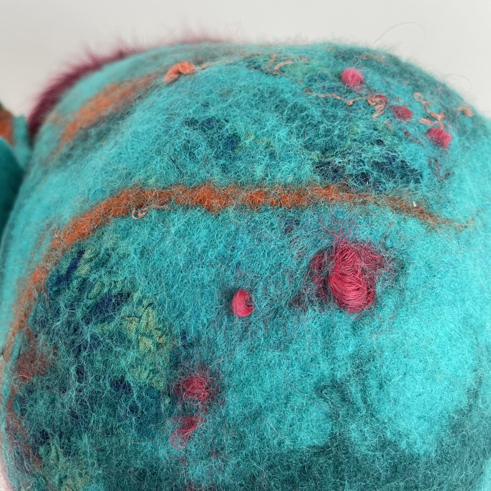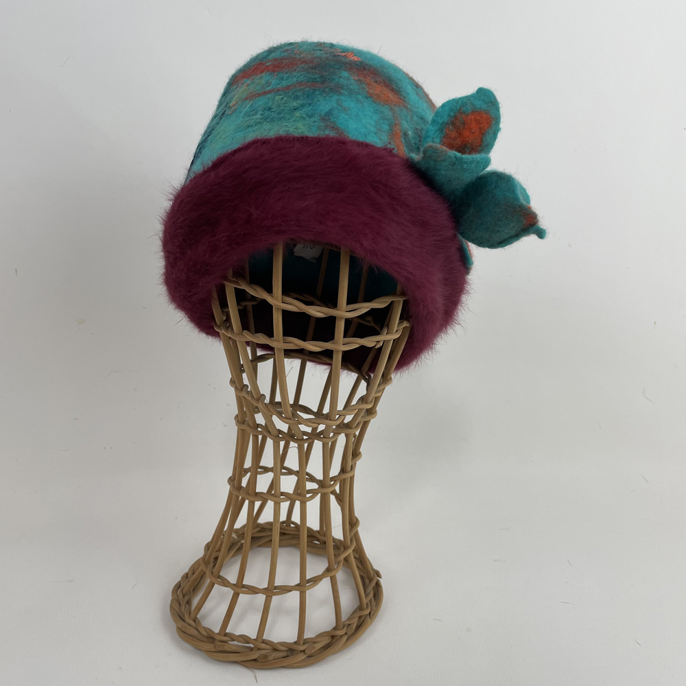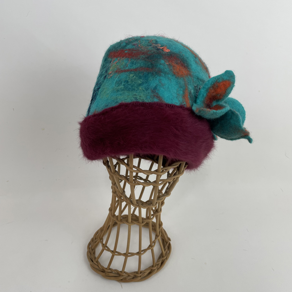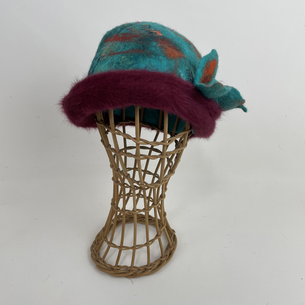 Il s’agit d’une étoffe confectionnée manuellement à partir de enchevêtrement de longues fibres de laines mérinos turquoise non filées et de l’incorporation de tissus de soie multicolores. Le feutrage à l’eau savonneuse tiède fige le motif intégré tout en créant le volume du chapeau.