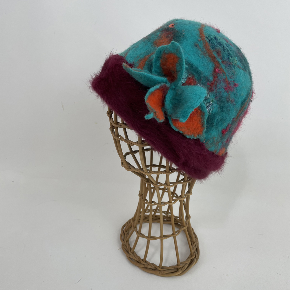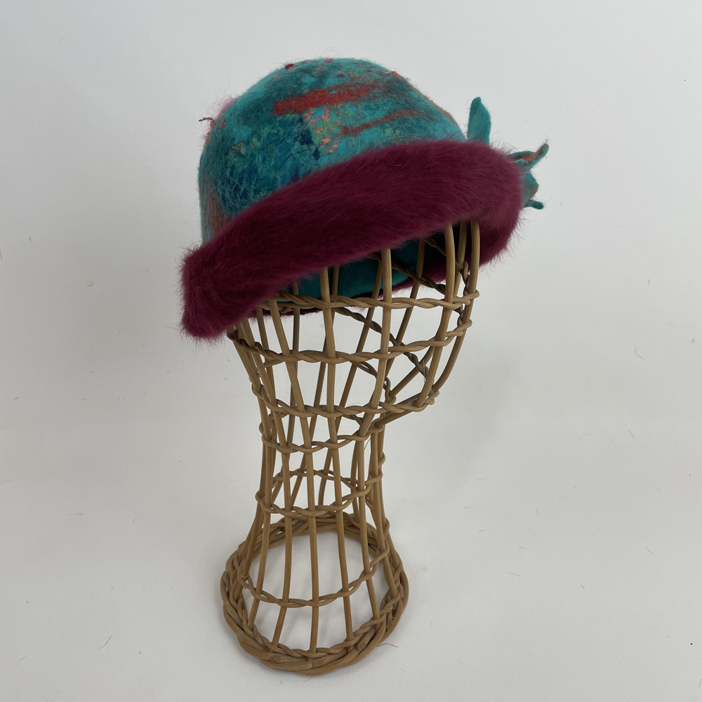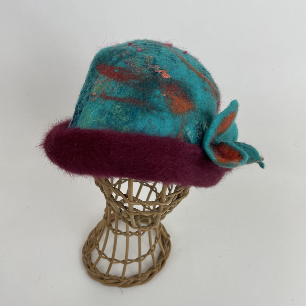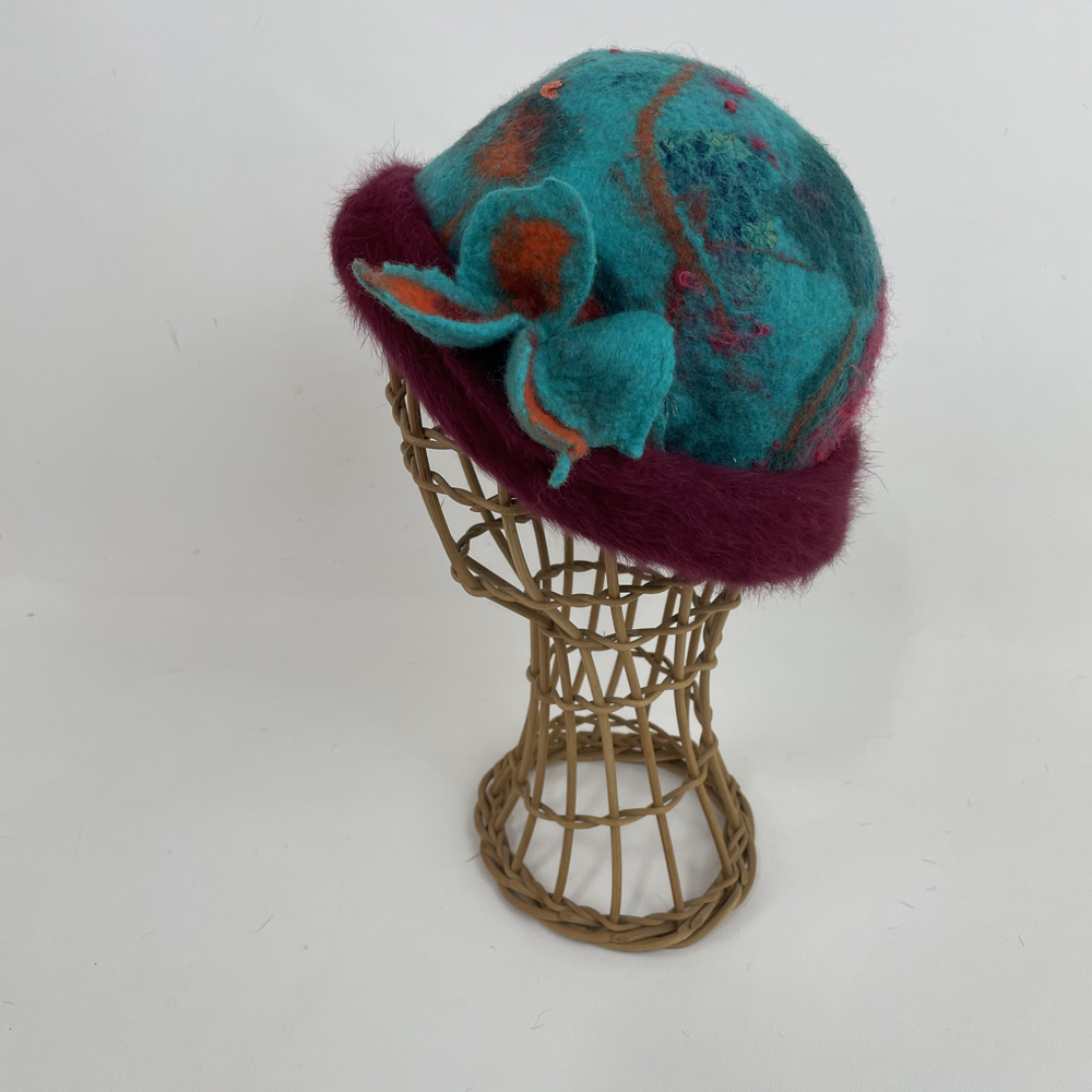 Bonnet en feutre nuno (laine mérinos 19 microns et soie) bleu turquoise et coloris chauds et angora prune.