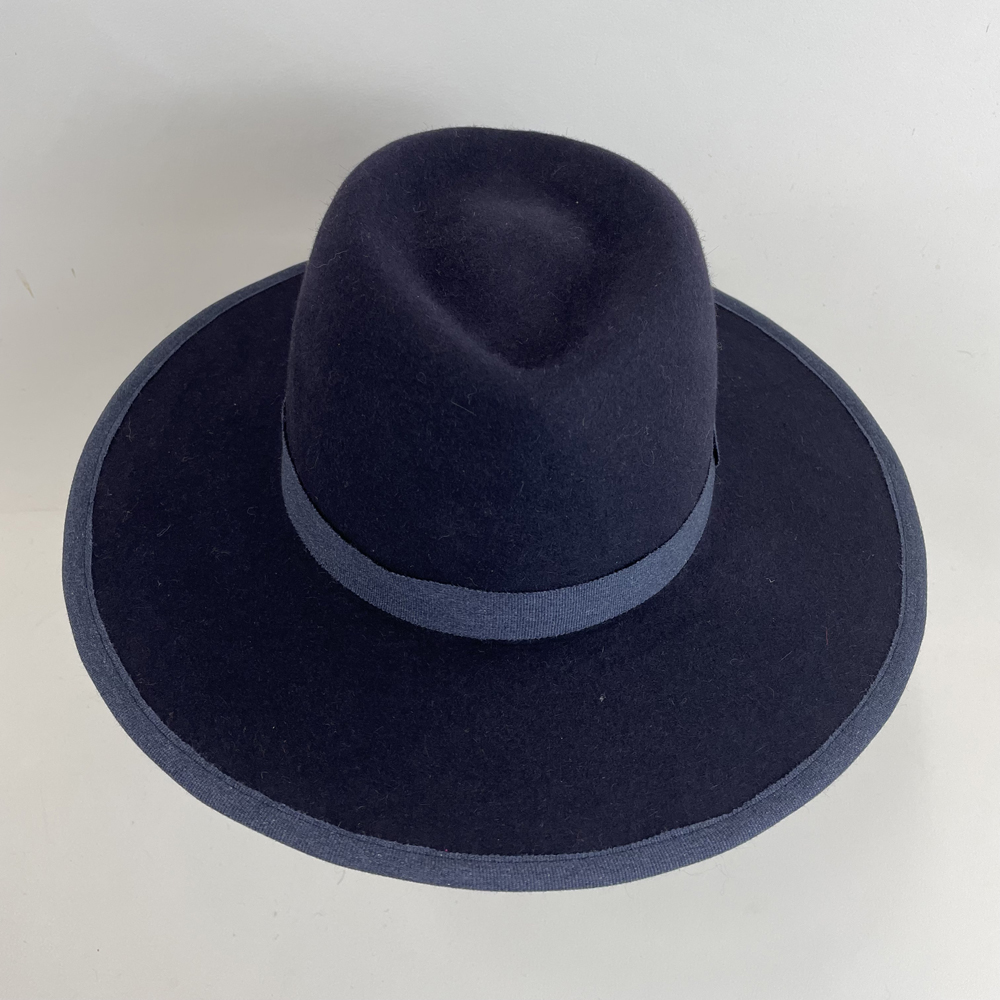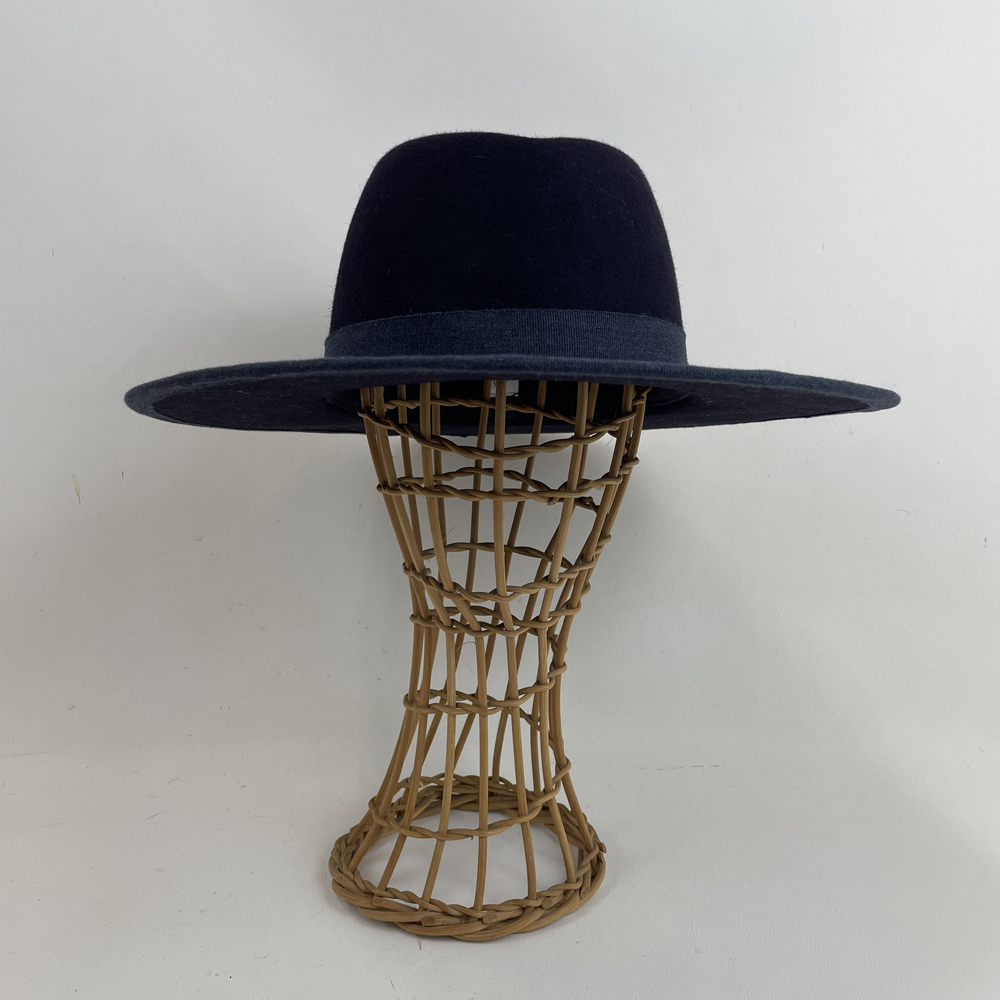 Chapeau Fédora en feutre de laine bleu marine, garni d’un gros grain en coton coordonné. Un chapeau mis en forme est un objet, aussi il se respecte comme tel et ne peut se plier. Stockage à plat.