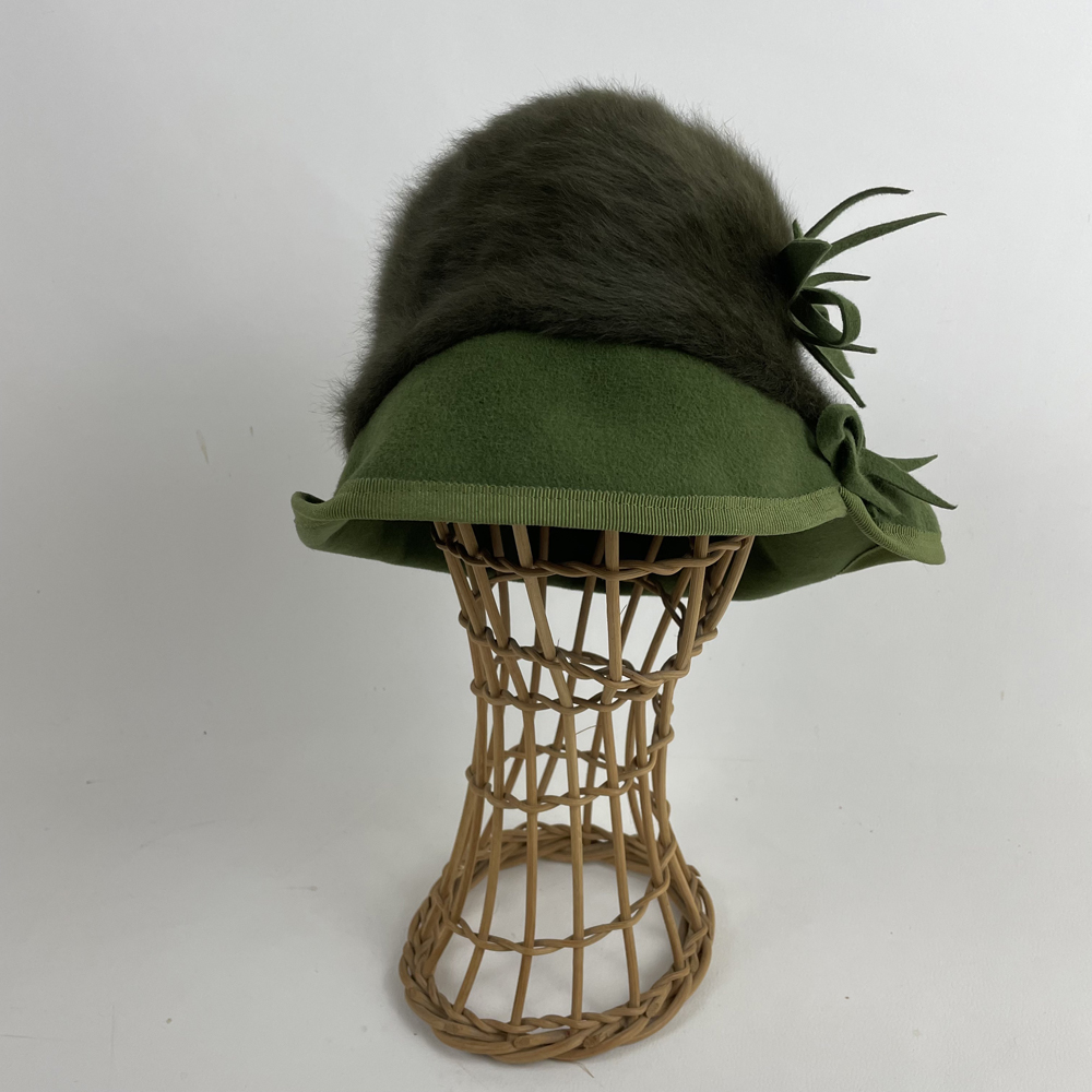 Chapeau en angora kaki et feutre taupé (lapin finition velours) vert amande, garni d’un gros grain en coton coordonné et de boucles de feutre.