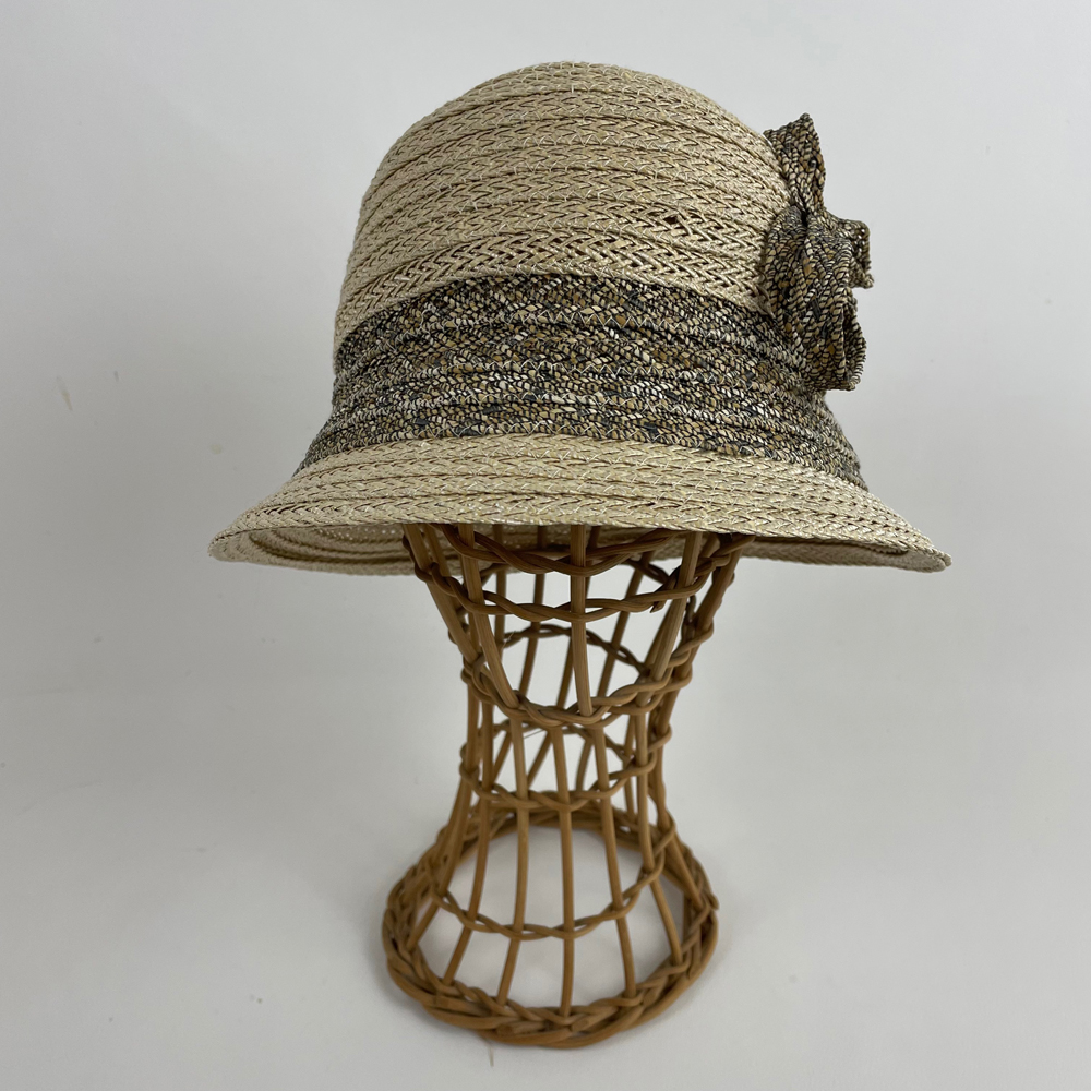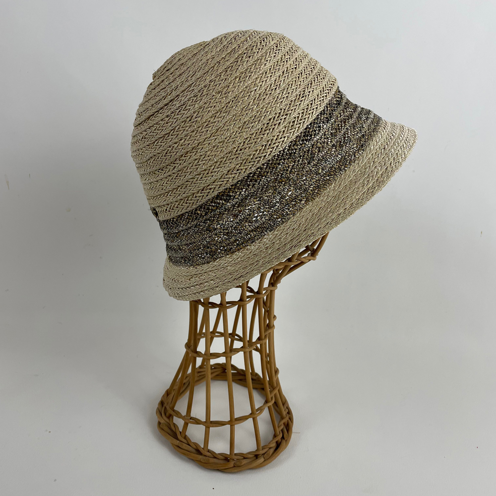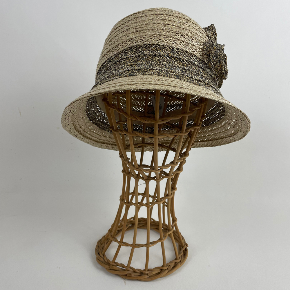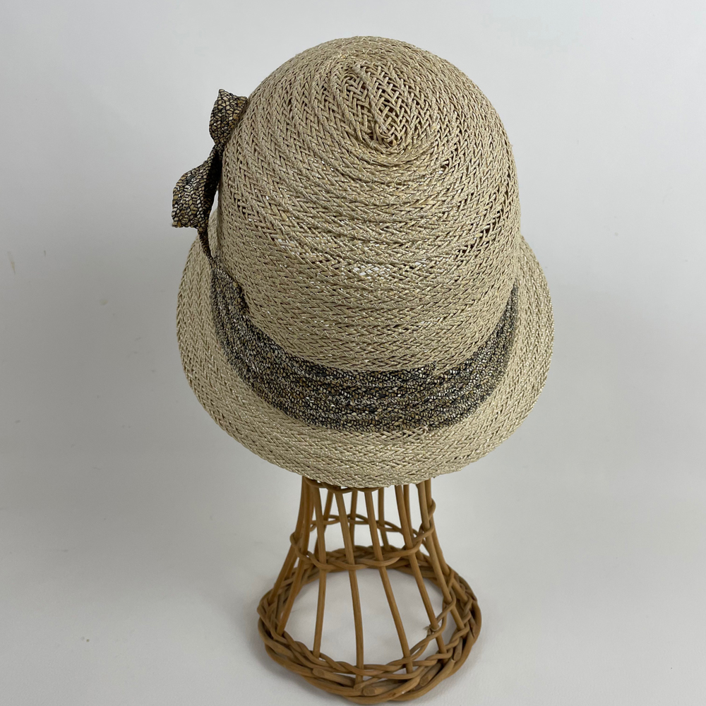 Chapeau cloche en paille : gallon de rafia ligaturé écru et moucheté beige marron garni d’une boucle coordonnée.