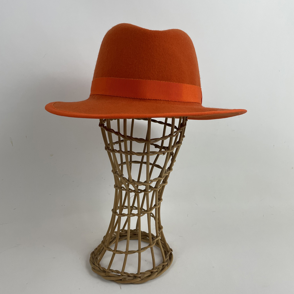 Chapeau Fédora en feutre de laine orange, garni d’un gros grain en coton coordonné. Un chapeau mis en forme est un objet, aussi il se respecte comme tel et ne peut se plier. Stockage à plat.