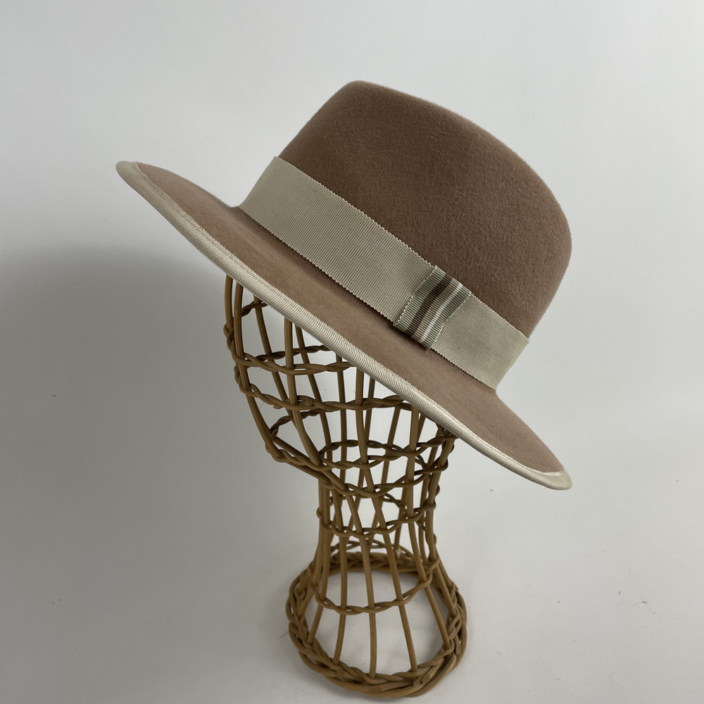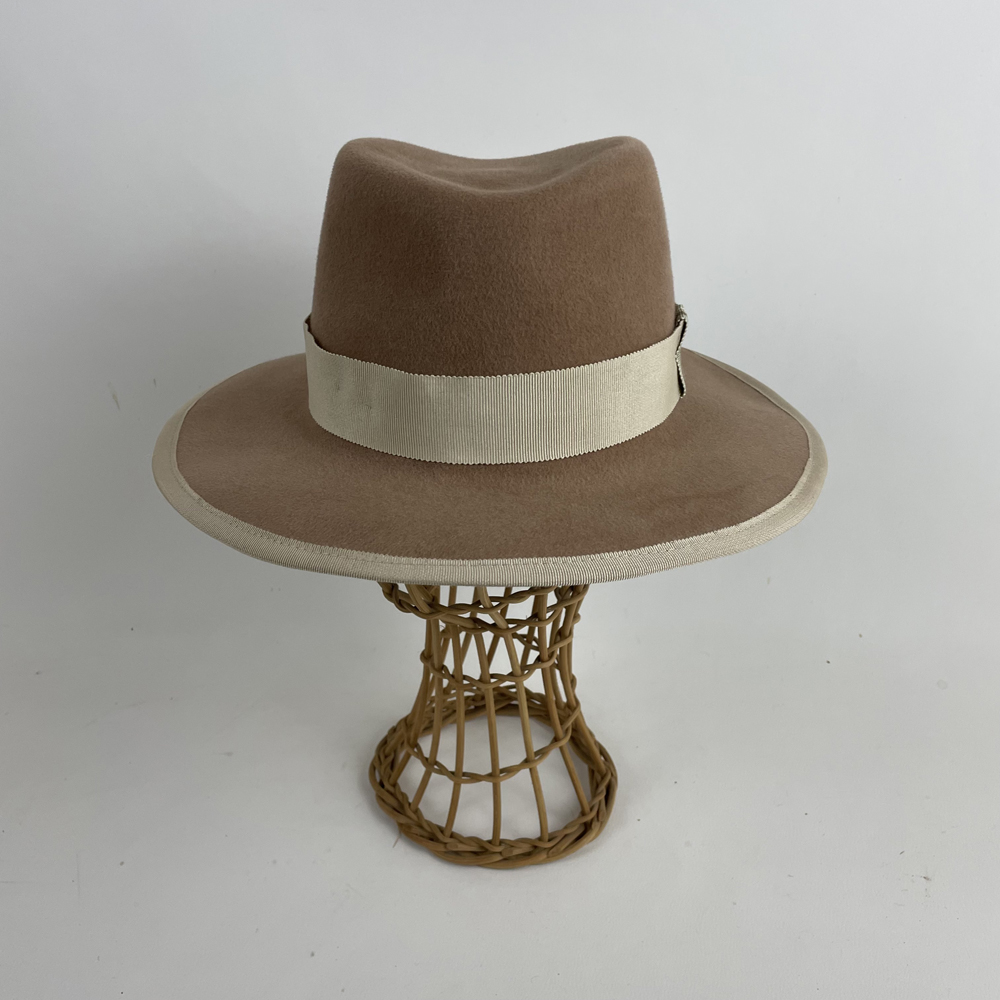 Chapeau Fédora en feutre taupé (lapin finition velours) beige, garni d’un gros grain en coton coordonné. Un chapeau mis en forme est un objet, aussi il se respecte comme tel et ne peut se plier. Stockage à plat.