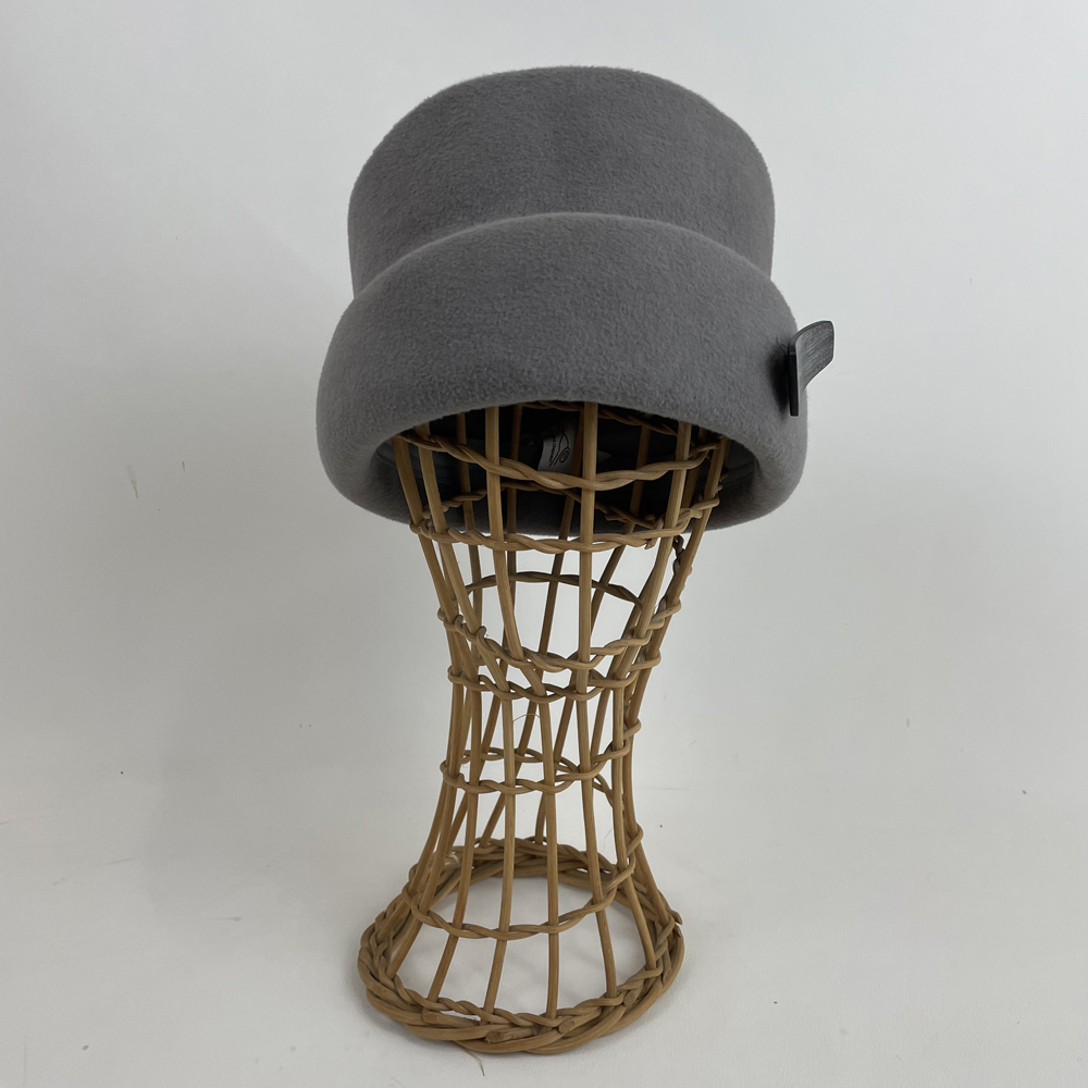 Bonnet ou toque en feutre taupé (feutre de lapin finition velours) gris souris garni d’un bouton en corne coordonné. Un chapeau “mis en forme” est un objet, aussi il se respecte comme tel et ne peut se plier. Stockage à plat.