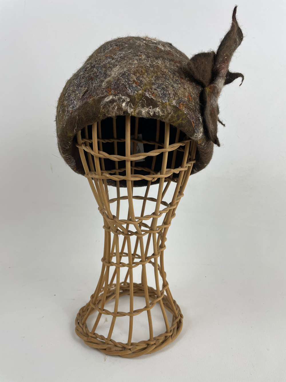 Il s’agit d’une étoffe confectionnée manuellement à partir de enchevêtrement de longues fibres de laines mérinos bleu marine non filées et de l’incorporation de tissus de soie multicolores. Le feutrage à l’eau savonneuse tiède fige le motif intégré tout en créant le volume du chapeau.