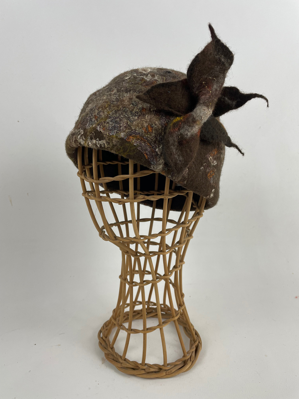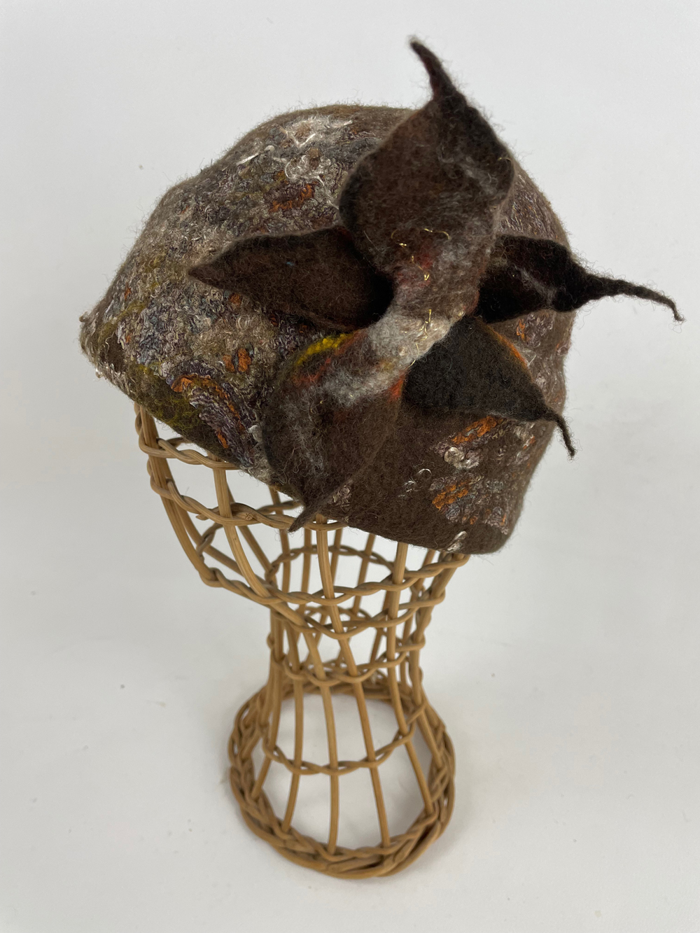 Bonnet ou calot en feutre nuno (laine mérinos 19 microns et soie) marron. Un chapeau “mis en forme” est un objet, aussi il se respecte comme tel et ne peut se plier. Stockage à plat.